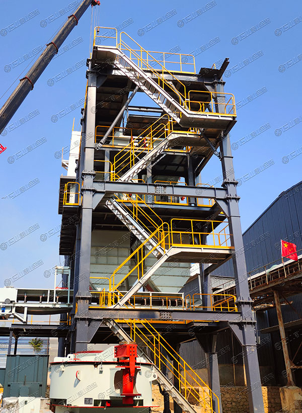 這套V9-150制砂樓,總投料量為150噸,整條生產線設備選型為:制砂選粉一體機、空氣篩、粗細粉分離機等。